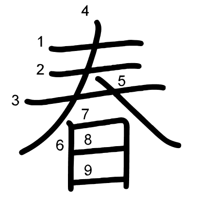 Readings: shun, haru, azuma, kasu, suno, hi, wara