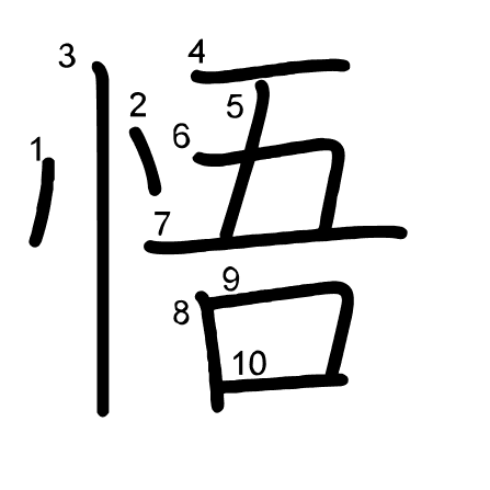 Hlavný radikál: 心 (61) Radikály: 一 口 忄 五 Džójó: 8