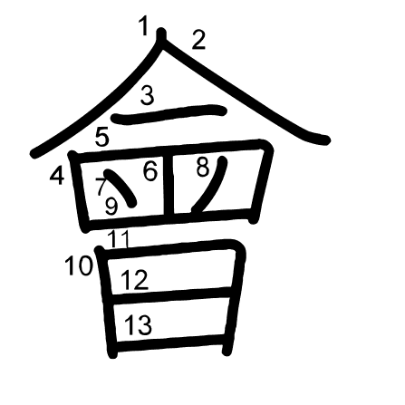 Hlavní radikál: 广 (53) Radikály: | ヨ ハ 广 并 Džójó: 8