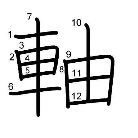 Main radical: 車 (159) Radicals: | 車 日 田 Jouyou: 8
