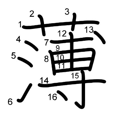 Hlavný radikál: 艸 (140) Ťahy: 16 obrázok (png) | animácie (svg) | tabuľka (svg)
