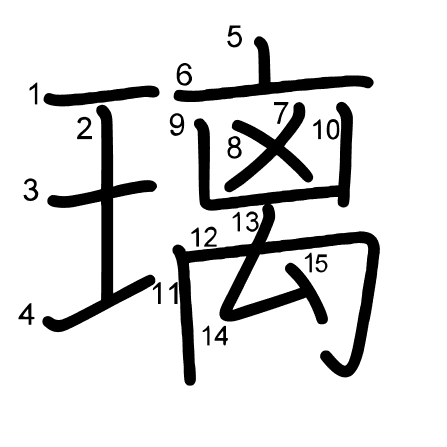 Hlavný radikál: 玉 (96) Ťahy: 14 obrázok (png) | animácie (svg) | tabuľka (svg)
