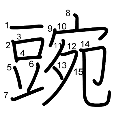 Hlavný radikál: 豆 (151) Ťahy: 15 obrázok (png) | animácie (svg) | tabuľka (svg)