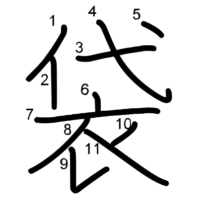 Hlavní radikál: 衣 (145) Tahy: 11 obrázek | animace | tabulka