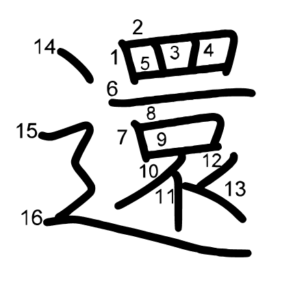 Hlavný radikál: 辵 (162) Ťahy: 16 obrázok (png) | animácie (svg) | tabuľka (svg)