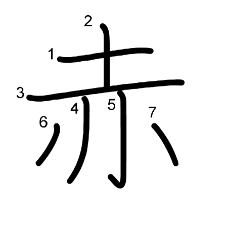 Hlavný radikál: 赤 (155) Ťahy: 7 obrázok (png) | animácie (svg) | tabuľka (svg)