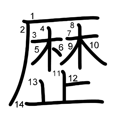 Main radical: 止 (77) Radicals: 广 Jouyou: 4