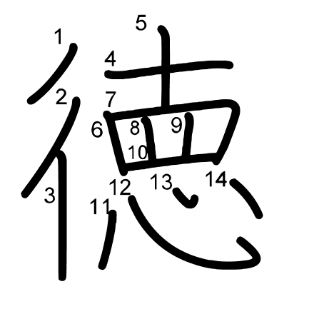 Hlavný radikál: 彳 (60) Radikály: 十 心 罒 彳 Džójó: 5