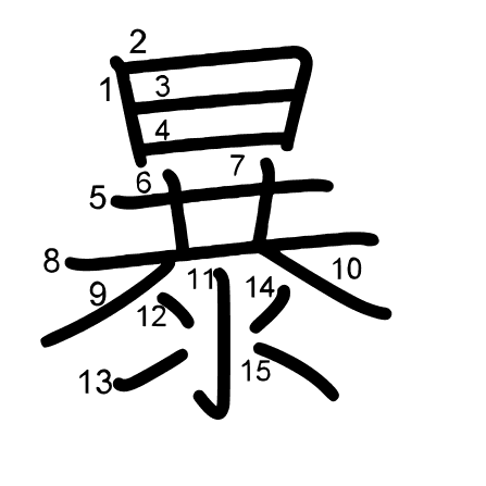 outburst, rave, fret, force, violence, cruelty, outrageHlavný radikál: 日 (72) Radikály: | 一 水 二 日 ハ 井 Džójó: 5