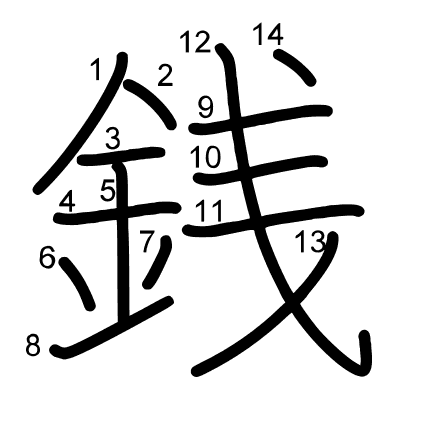 Hlavný radikál: 金 (167) Radikály: ノ 金 毛 丶 Džójó: 5