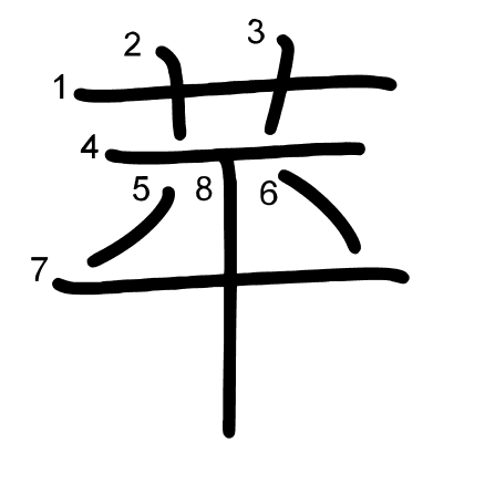 Hlavný radikál: 艸 (140) Radikály: ノ 一 口 ⺾ Džójó: 6