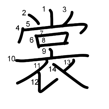 Hlavní radikál: 宀 (40) Radikály: 一 心 罒 亅 宀 Džójó: 8