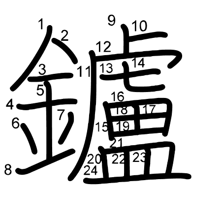 Main radical: 金 (167) Radicals: 金 皿 臣 二 Jouyou: 8