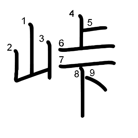 mountain peak, mountain pass, climax, crest, (kokuji)