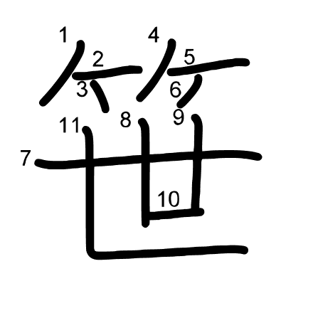 Hlavní radikál: 人 (9) Radikály: ⺅ 心 田 Džójó: 9