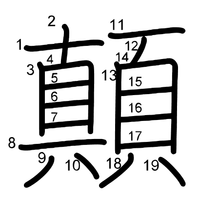 Hlavný radikál: 頁 (181) Radikály: 貝 目 ハ 戸 頁 隹 一 尸 Džójó: 8