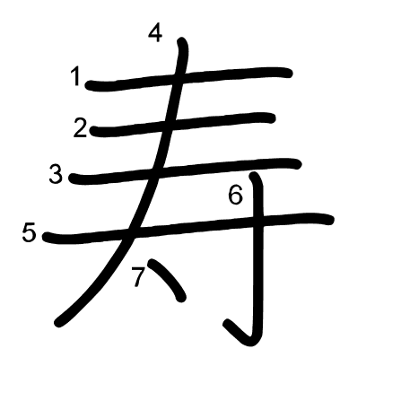 Čtení: džu, su, šuu, kotobuki, kotobu.ku, kotoho.gu, kazu, dži, džuu, sut, sumi, toši, tošikacu, naga, nobu, nori, hisa, hisaši, jasu
