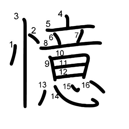 Hlavní radikál: 心 (61) Tahy: 16 obrázek | animace | tabulka