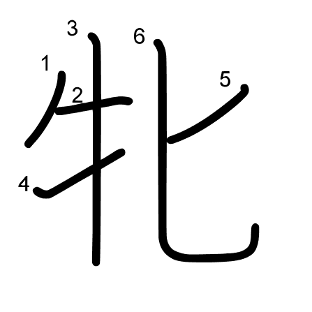 Hlavní radikál: 牛 (93) Tahy: 6 obrázek | animace | tabulka