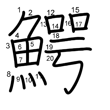 Hlavný radikál: 魚 (195) Ťahy: 20 obrázok (png) | animácie (svg) | tabuľka (svg)