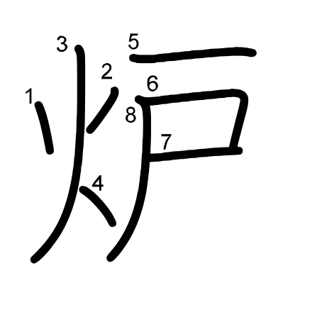 Hlavní radikál: 火 (86) Tahy: 8 obrázek | animace | tabulka