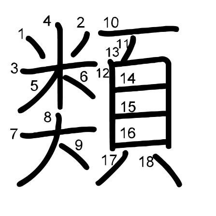 Hlavní radikál: 頁 (181) Tahy: 18 obrázek | animace | tabulka
