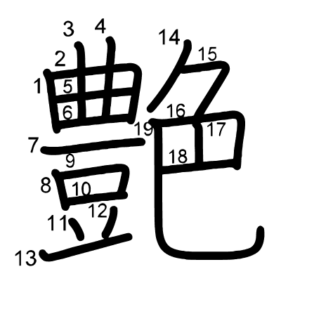 Hlavní radikál: 色 (139) Tahy: 19 obrázek | animace | tabulka