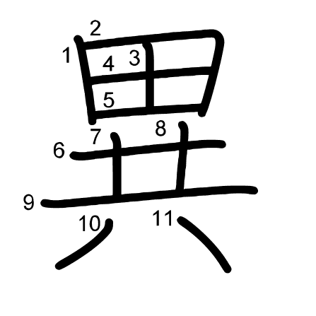 Hlavný radikál: 田 (102) Ťahy: 11 obrázok (png) | animácie (svg) | tabuľka (svg)