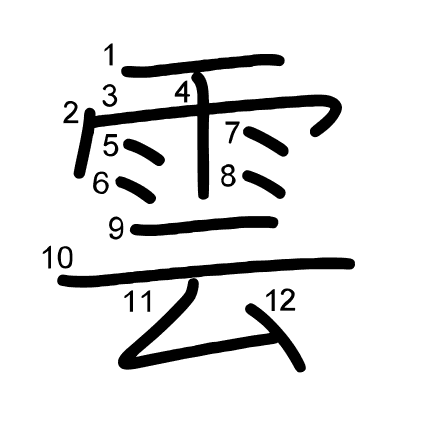 Hlavný radikál: 雨 (173) Ťahy: 12 obrázok (png) | animácie (svg) | tabuľka (svg)