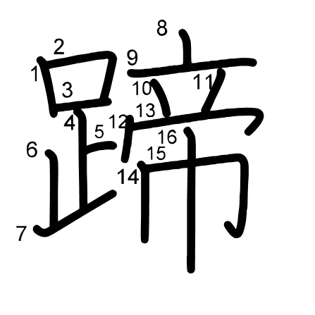 Hlavný radikál: 足 (157) Ťahy: 16 obrázok (png) | animácie (svg) | tabuľka (svg)