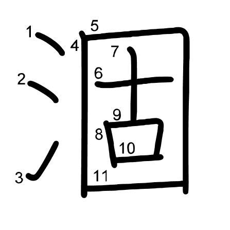 Hlavní radikál: 水 (85) Tahy: 11 obrázek | animace | tabulka