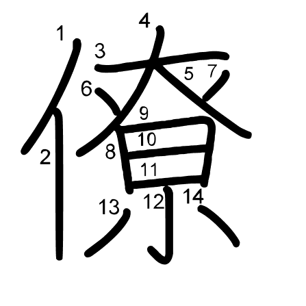 Hlavný radikál: 人 (9) Ťahy: 14 obrázok (png) | animácie (svg) | tabuľka (svg)