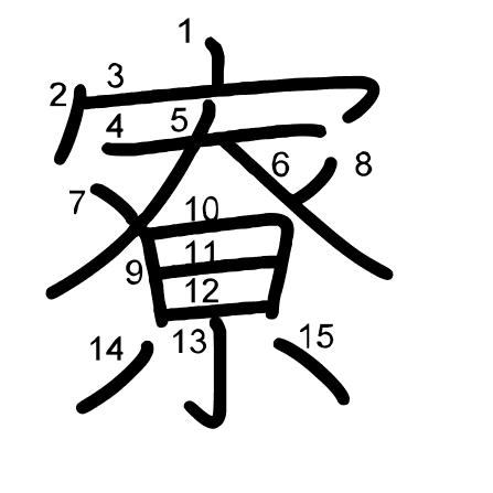 Hlavní radikál: 宀 (40) Tahy: 15 obrázek | animace | tabulka
