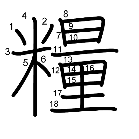 Hlavný radikál: 米 (119) Ťahy: 18 obrázok (png) | animácie (svg) | tabuľka (svg)
