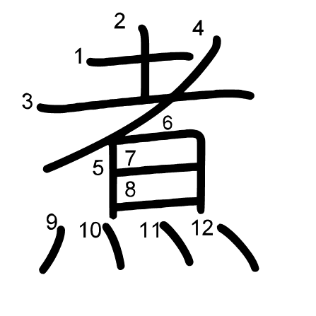 Hlavný radikál: 火 (86) Ťahy: 12 obrázok (png) | animácie (svg) | tabuľka (svg)