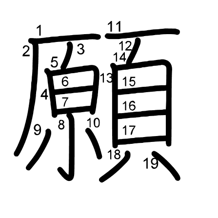 Hlavní radikál: 頁 (181) Tahy: 19 obrázek | animace | tabulka