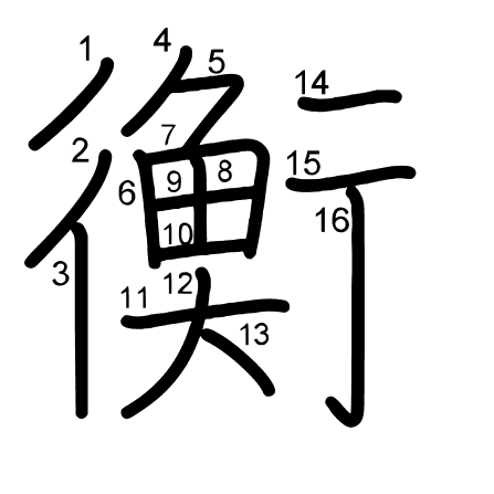Hlavný radikál: 行 (144) Ťahy: 16 obrázok (png) | animácie (svg) | tabuľka (svg)