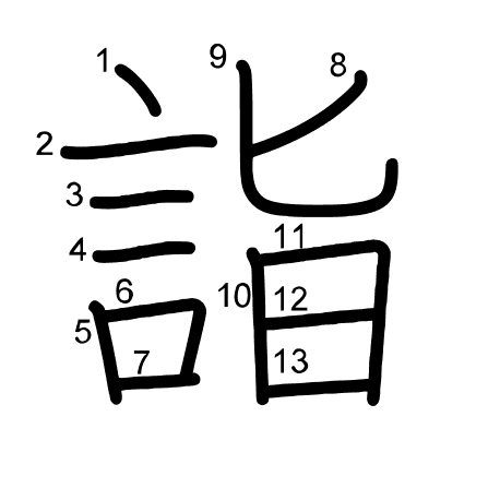 Main radical: 言 (149) Strokes: 13 picture (png) | animation (svg) | table (svg)