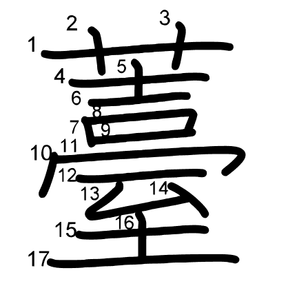 Hlavní radikál: 艸 (140) Tahy: 17 obrázek | animace | tabulka