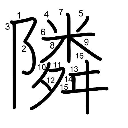 Hlavný radikál: 阜 (170) Ťahy: 16 obrázok (png) | animácie (svg) | tabuľka (svg)