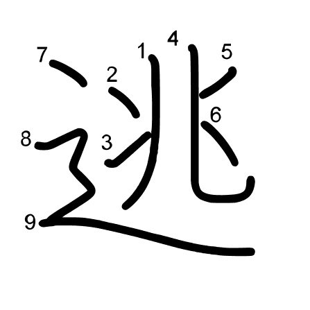 Hlavný radikál: 辵 (162) Ťahy: 9 obrázok (png) | animácie (svg) | tabuľka (svg)