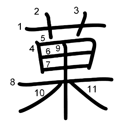 Hlavný radikál: 艸 (140) Ťahy: 11 obrázok (png) | animácie (svg) | tabuľka (svg)
