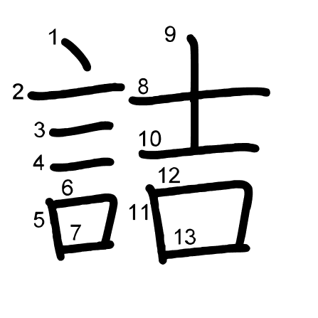 Hlavný radikál: 言 (149) Ťahy: 13 obrázok (png) | animácie (svg) | tabuľka (svg)