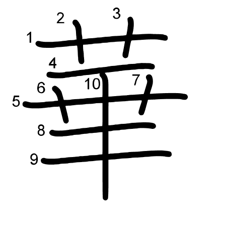 Hlavní radikál: 艸 (140) Tahy: 10 obrázek | animace | tabulka