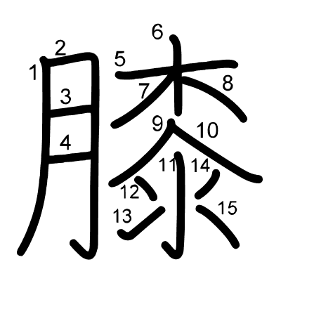 Hlavný radikál: 肉 (130) Ťahy: 15 obrázok (png) | animácie (svg) | tabuľka (svg)
