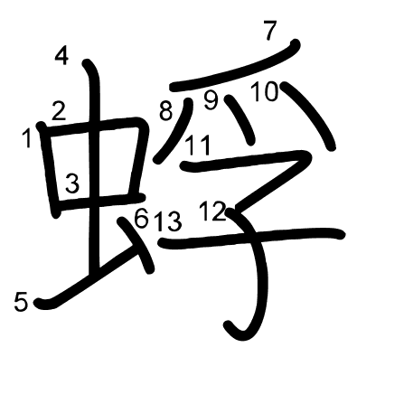 Hlavný radikál: 虫 (142) Ťahy: 13 obrázok (png) | animácie (svg) | tabuľka (svg)