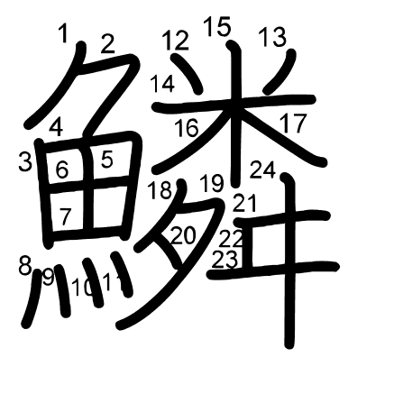 Hlavní radikál: 魚 (195) Tahy: 24 obrázek | animace | tabulka