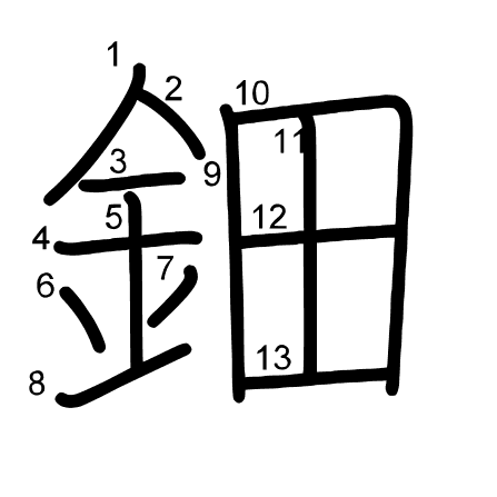 Hlavní radikál: 金 (167) Tahy: 13 obrázek | animace | tabulka