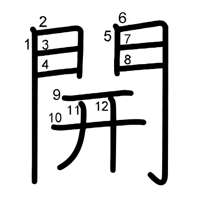 Hlavný radikál: 門 (169) Ťahy: 12 obrázok (png) | animácie (svg) | tabuľka (svg)