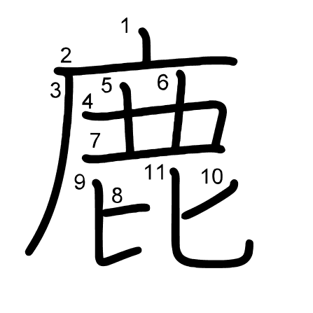 Main radical: 鹿 (198) Strokes: 11 picture (png) | animation (svg) | table (svg)
